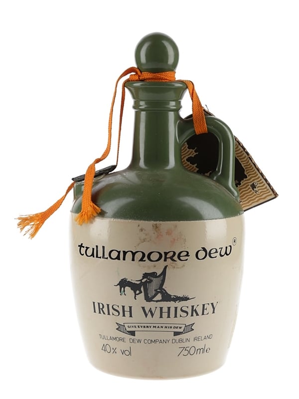 A bottle of Tullamore Dew A Blend of Rare Old Irish Whiskey presented in a ceramic decanter. This was shipped and bottled by Tullamore Dew Company, we estimate in the 1980s.
