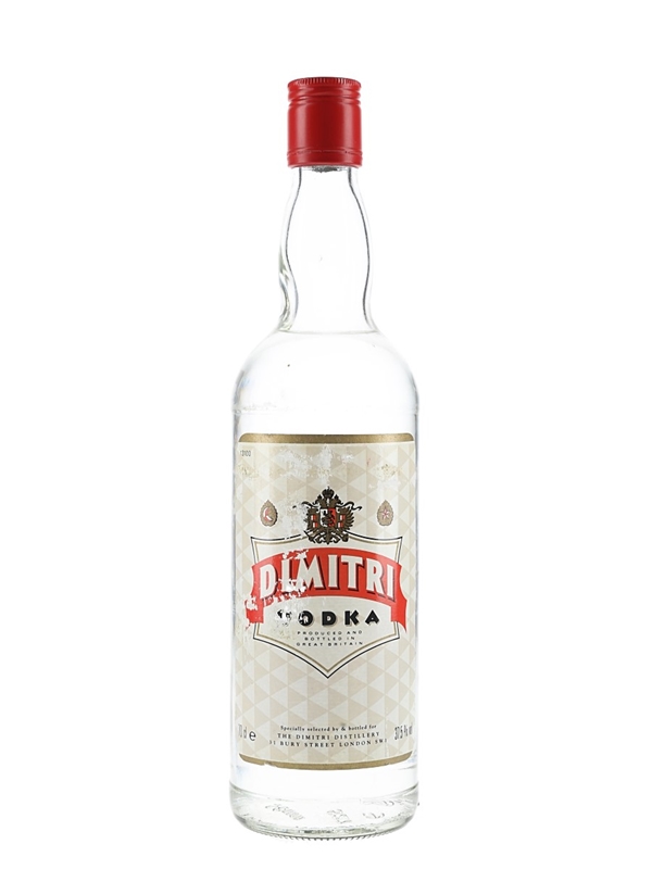 A bottle of Dimitri Vodka, produced and bottled in Great Britain by Dimitri Distillery. We estimate this was bottled in the 1990s.