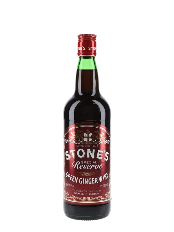 A bottle of Stone's Special Reserve Green Ginger Wine, a fortified liqueur wine made with ground ginger and raisins, first produced in England in the 18th century. This was specially blended to produce extra strength.