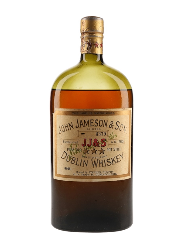 A bottle of John Jameson & Son 3 Star Dublin Whiskey bottled by Stephen Dunphy. We estimate this was bottled in the 1930s.