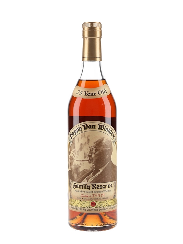 A bottle of Pappy Van Winkle's 23 Year Old Family Reserve Kentucky Straight Bourbon Whiskey, bottled by Old Rip Van Winkle Distillery, Frankfort. This was imported to England by Hi-Spirits Ltd.