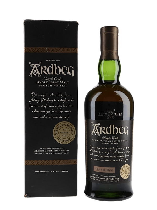 A bottle of Ardbeg 1975 Single Cask Single Islay Malt Scotch Whisky. This was distilled on 26th December 1975, matured in a single sherry butt and bottled on 26 March 2002. This was released exclusively for the German market.