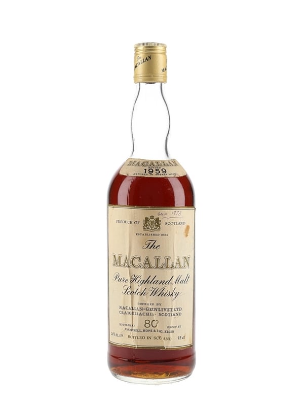 A bottle of The Macallan 1959 Pure Highland Malt Scotch Whisky, matured in sherry casks. This was bottled by Campbell, Hope & King, we estimate in the 1970s.