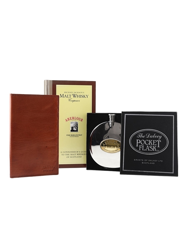 Assorted Whisky Memorabilia Aberlour Dalvey Pocket Flask, Aberlour Leather Wallet, Michael Jackson's Malt Whisky Companion