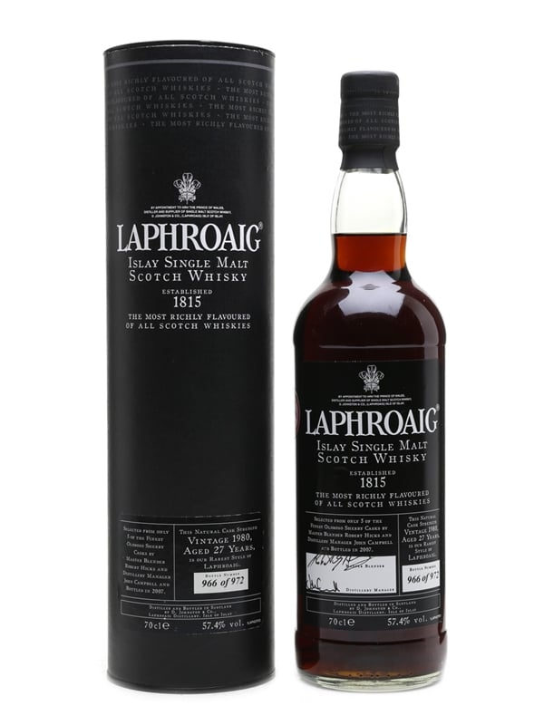 A bottle of Laphroaig 27 Year Old, distilled in 1980 and bottled in 2007. This bottling was drawn from five oloroso sherry casks selected by Master Blender Robert Hicks and Distillery Manager John Campbell, and bottled at cask strength with no colour added.