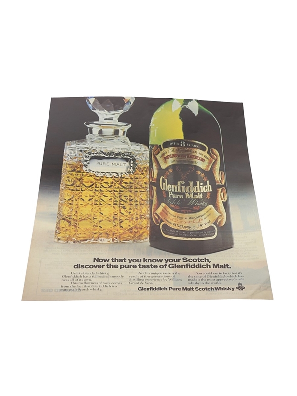 An advertising print for Glenfiddich Scotch Whisky 'Now that you know your Scotch, discover the pure taste of Glenfiddich Malt' from the 1980s, measuring approximately 30cm x 22cm.