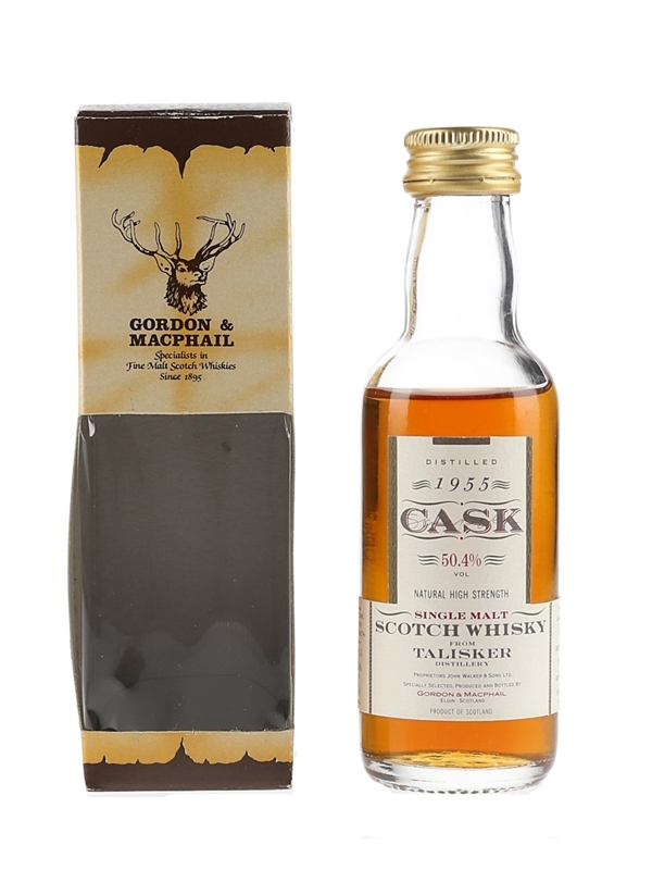 A miniature bottle of Talisker 1955 Single Malt Scotch Whisky. This was distilled on 3 June 1955 and bottled in June 1992 by Gordon & MacPhail as part of their Cask Strength series.