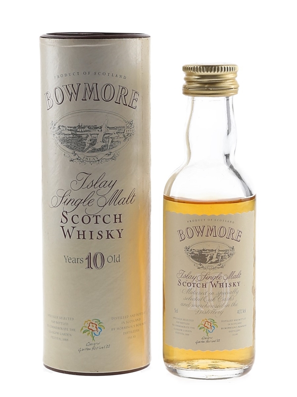 A miniature bottle of Bowmore 10 Year Old Islay Single Malt Scotch Whisky, bottled to celebrate the Glasgow Garden Festival in 1988.