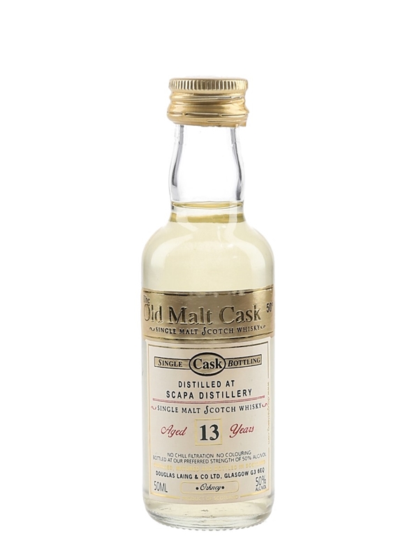 A miniature bottle of Scapa 13 Year Old Single Malt Scotch Whisky, bottled by Douglas Laing for the Old Malt Cask series.