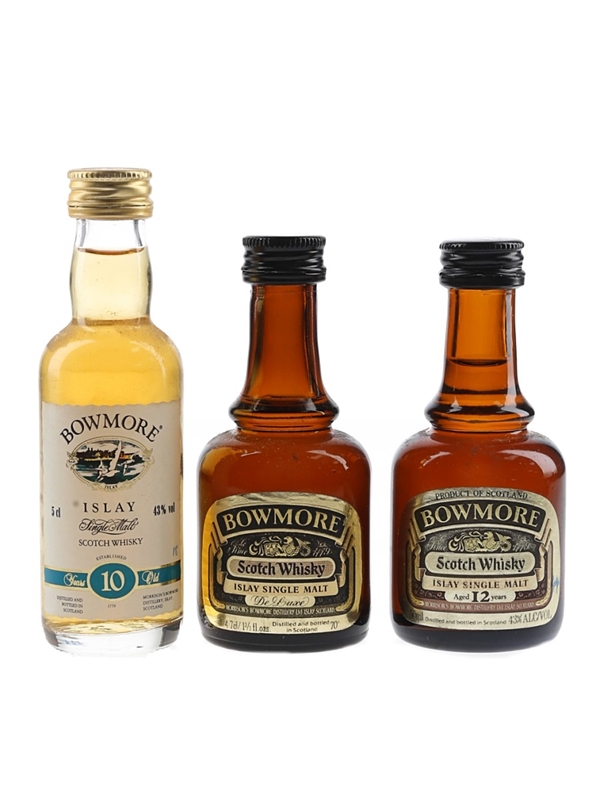 This lot contains three miniature bottles of Bowmore 10 Year Old and 12 Year Old Single Malt Scotch Whisky.