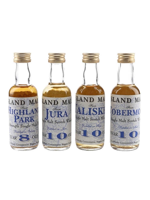 This lot contains four miniature bottles of Highland Park 8 Year Old, Talisker 10 Year Old, Jura 10 Year Old and Tobermory 10 Year Old Single Malt Scotch Whisky bottled by The Whisky Connoisseur.