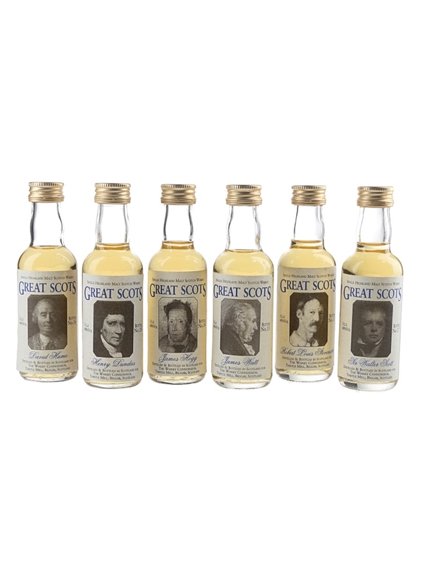 This lot contains six miniature bottles of Single Highland Malt Scotch Whisky, bottled by The Whisky Connoisseur as part of Great Scots series.