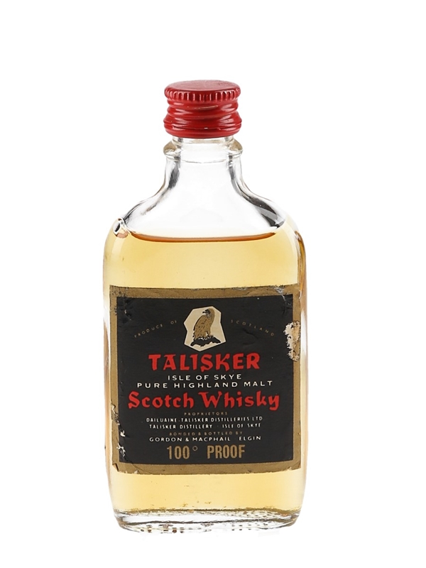 A miniature bottle of Talisker 100 Proof Isle Of Skye Pure Highland Malt Scotch Whisky with the black label, gold eagle design. This was bonded and bottled by Gordon & MacPhail, we estimate in the 1970s.