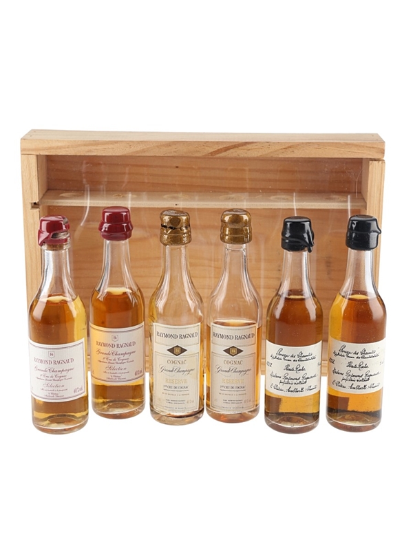 This lot contains six miniature bottles of Raymond Ragnaud Cognac in a wooden presentation box.