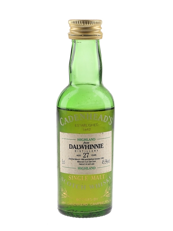 A miniature bottle of Dalwhinnie Highland Single Malt Scotch Whisky. This was distilled in March 1966, matured for 27 years and bottled in October 1993 by Cadenhead's at 45.5% ABV.