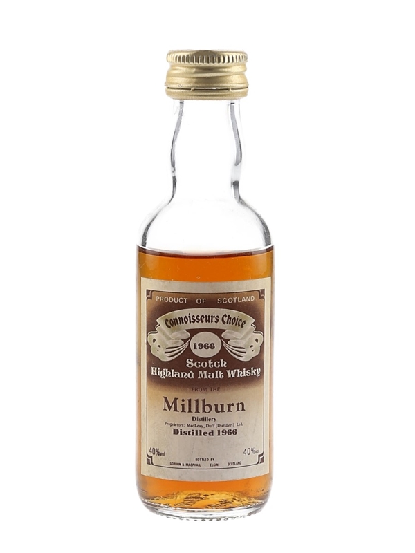 A miniature bottle of Millburn 1966 Scotch Highland Malt Whisky, bottled by Gordon & MacPhail as part of their Connoisseurs Choice series. We estimate this was bottled in the 1980s.
