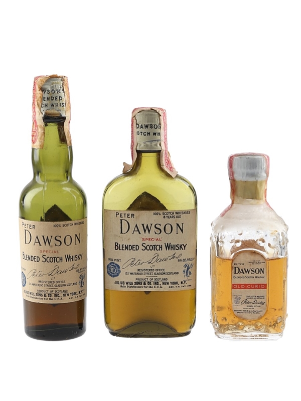 This lot contains three miniature bottles of Dawson's Special 8 Year Old, Special & Old Curio Blended Scotch Whisky, bottled by Peter Dawson Ltd. These were imported to the US by Julius Wile Sons & Co., we estimate in the 1950s.