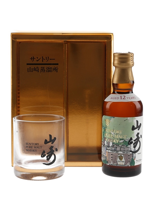 A miniature of Suntory Yamazaki 12 Year Old Single Malt Whisky with an image of the distillery on the label. We estimate this was bottled in the 1990s. This comes in a giftpack with a Suntory branded shot glass.