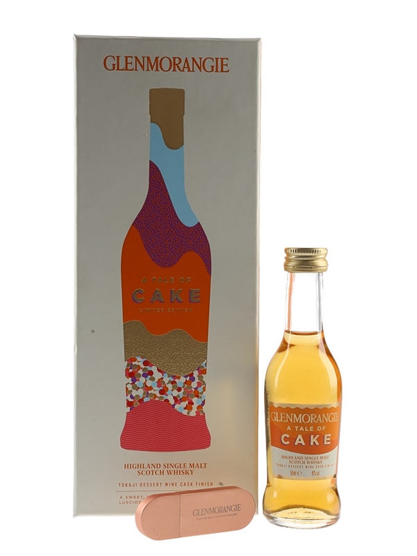 A miniature bottle of Glenmorangie A Tale of Cake Highland Single Malt Scotch Whisky, which spent its final maturation period in Tokaji dessert wine casks. This comes in a presentation box with a memory stick.