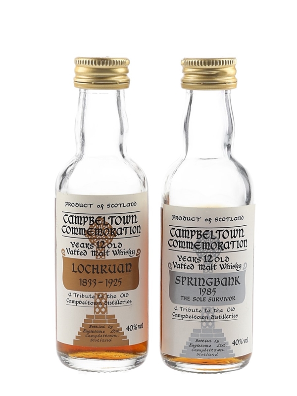 This lot contains two miniature bottles of Springbank 1985 12 Year Old and Lochruan bottled as a tribute to the Old Campbeltown distilleries.