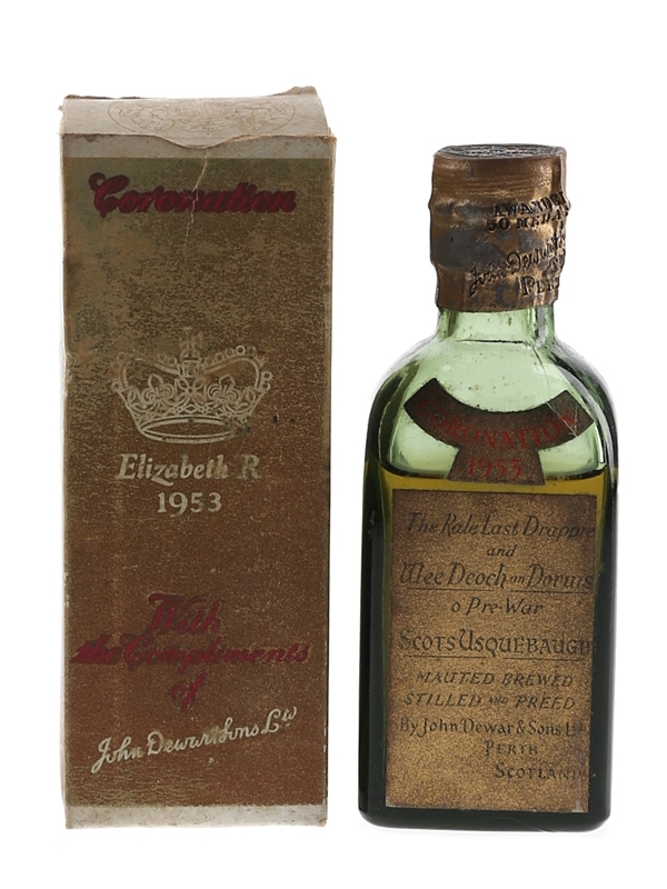 A miniature bottle of Dewar's Coronation sealed with a spring cap closure, bottled in 1953 to commemorate Queen Elizabeth II's coronation .