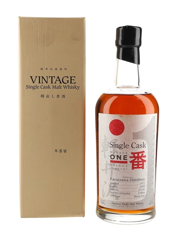 A bottle of Karuizawa 1972 Japanese Single Malt Whisky. This was distilled in 1972, matured in a single sherry butt, and bottled in 2008. This was imported to the UK by The Number One Drinks Company Ltd.