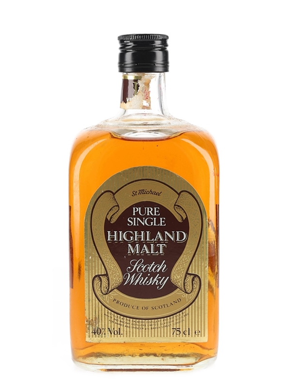 A bottle of St. Michael Pure Single Highland Malt 10 Year Old Scotch Whisky, distilled at Dalmore distillery. This was bottled by Whyte & Mackay for Marks and Spencer Plc Baker Street. We estimate this was bottled in the 1980s.