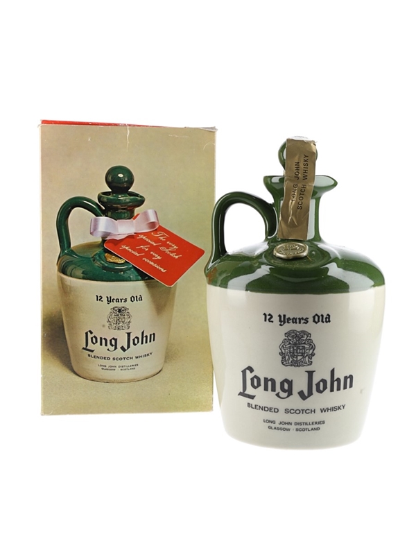 A bottle of Long John 12 Year Old Blended Scotch Whisky presented in a ceramic decanter. This was imported to the Chinese market, we estimate in the 1980s.