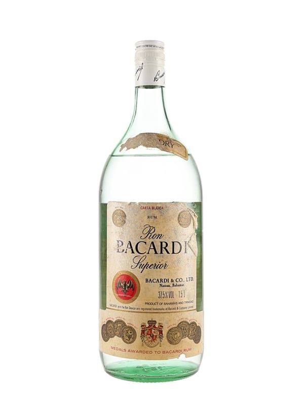 A 150cl bottle of Bacardi Carta Blanca Superior rum, produce of the Bahamas and Trinidad. We estimate this was bottled in the 1980s.