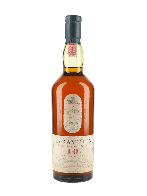 A bottle of Lagavulin 16 Year Old Single Islay Malt Scotch Whisky, part of Diageo's Classic Malts of Scotland range. We estimate this was bottled in the 1990s, when the distillery was still owned by White Horse Distillers.
