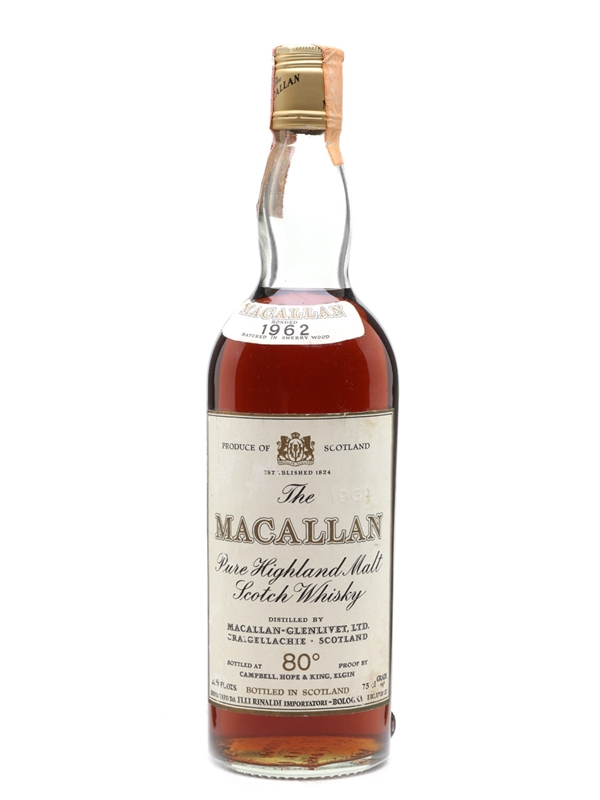 A bottle of The Macallan 1962, bottled by Campbell, Hope & King. This was bottled for the Italian market and imported by Rinaldi, we estimate in the 1970s.