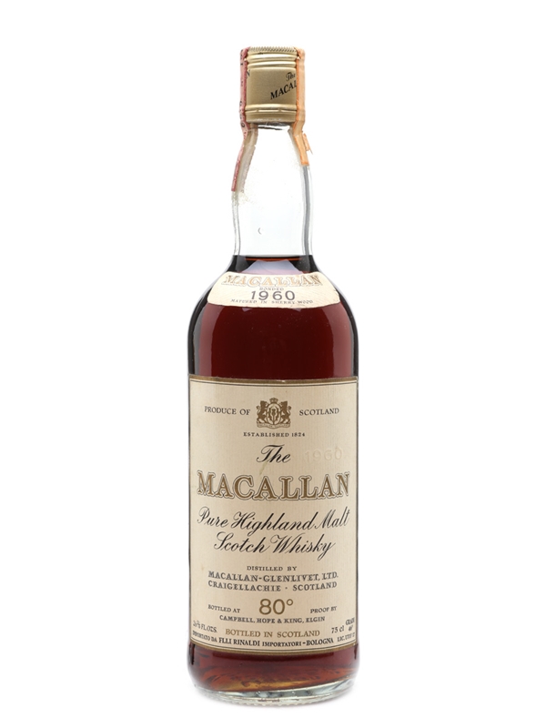 A bottle of The Macallan 1960, bottled by Campbell, Hope & King. This was bottled for the Italian market and imported by Rinaldi, we estimate in the 1970s.