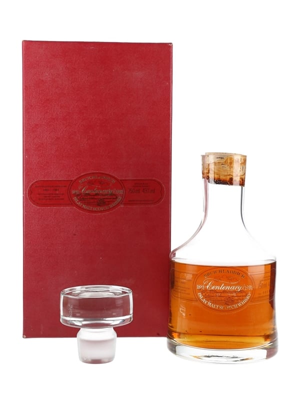 A decanter of Bruichladdich 15 Year Old Single Malt Scotch Whisky, bottled to celebrate the distillery's centenary in 1981.