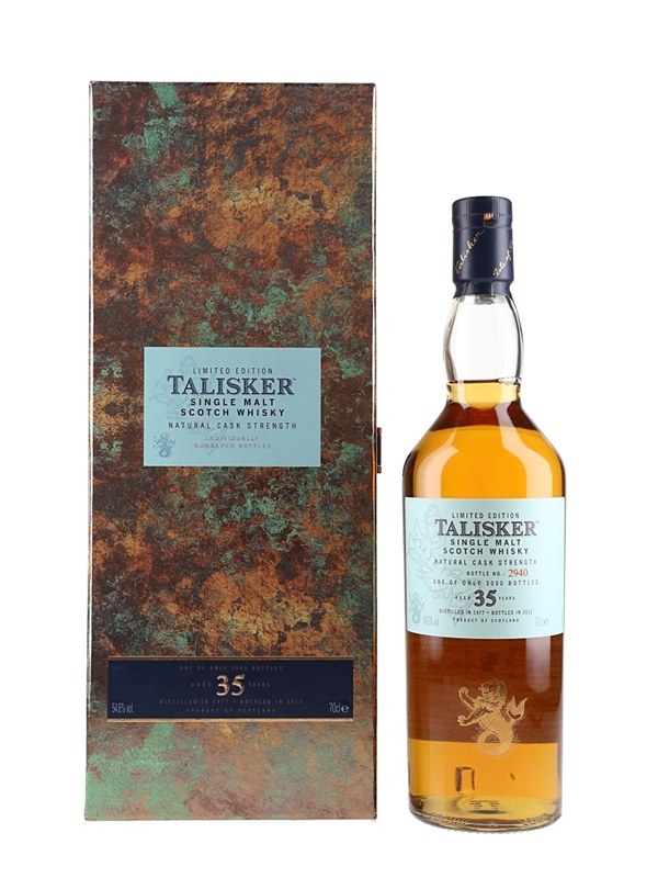 A limited edition bottle of Talisker 35 Year Old Single Malt Scotch Whisky. This was distilled in 1977, matured in a combination of refill American and European oak casks and bottled in 2012 for Diageo's Special Releases series.