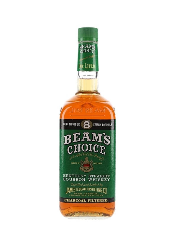 A litre bottle of Beam's Choice 5 Year Old Sour Mash Charcoal Filtered Kentucky Straight Bourbon Whiskey. We estimate this was bottled in the 1990s.