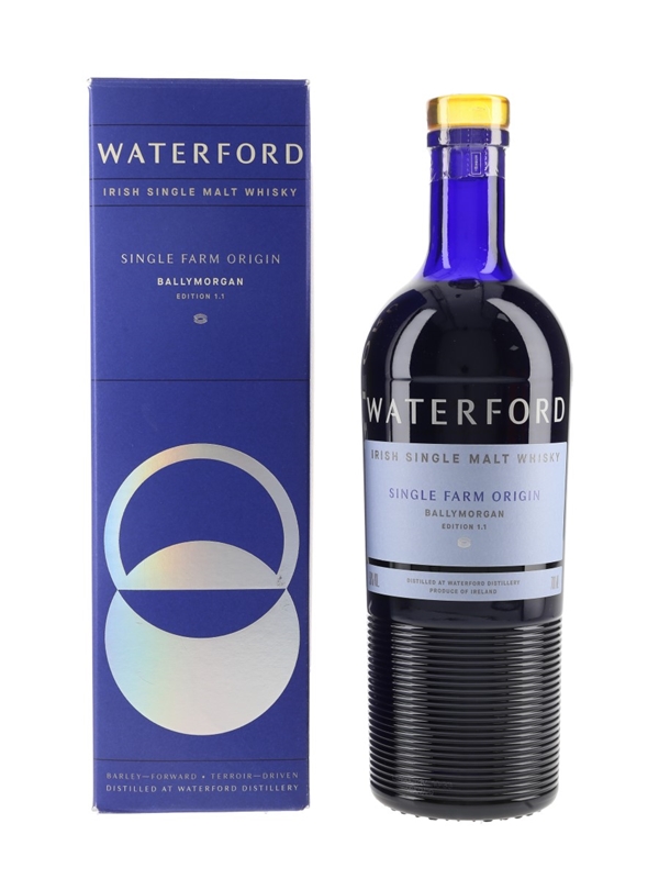 A bottle of Waterford Single Farm Origin Irish Single Malt Whisky, Ballymorgan Edition 1.1. The barley for this whisky was grown in Ballymorgan by Robert Milne and harvested on 13 September 2015. This was distilled in the 22nd week of 2016, matured for 3 years, 10 months and 23 days and bottled in June 2020 at 50% ABV.