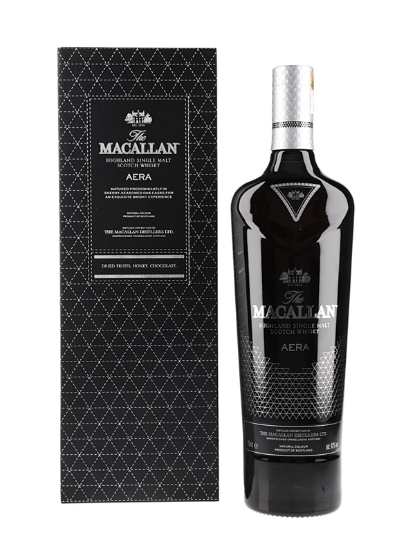 A bottle of The Macallan Aera Highland Single Malt Scotch Whisky. This was matured in sherry-seasoned casks and bottled for the Taiwanese market in 2018.