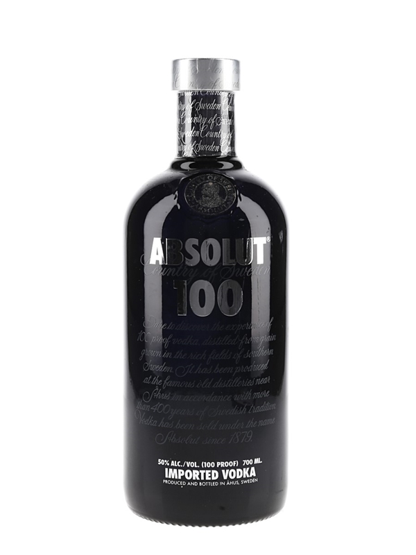 A bottle of Absolut 100 Vodka produced in Sweden.