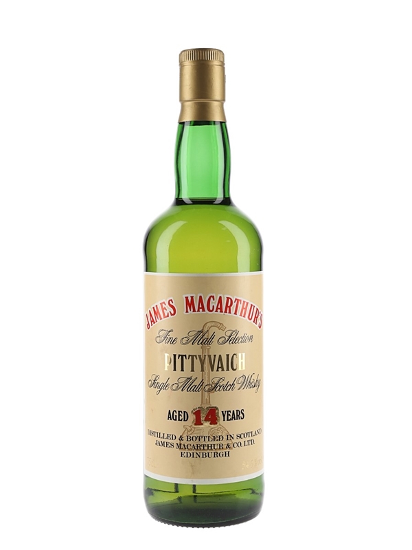 A bottle of James Macarthur's Pittyvaich 14 Year Old Single Highland Malt Scotch Whisky bottled at cask strength of 54.5% ABV. We estimate this was bottled in the 1980s.