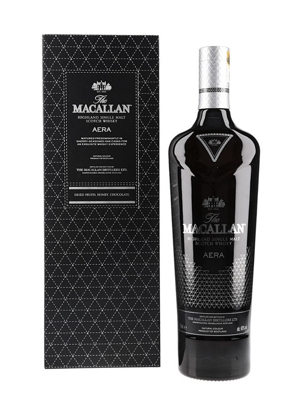 A bottle of The Macallan Aera Highland Single Malt Scotch Whisky. This was matured in sherry-seasoned casks and bottled for the Taiwanese market in 2018.