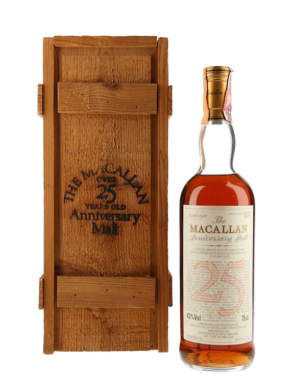 A bottle of The Macallan Single Highland Malt Scotch Whisky. This was distilled in 1965 matured in sherry casks for 25 years and bottled in 1991 as part of the Anniversary Malt series. This was imported to Italy by Giovinetti & Figli.