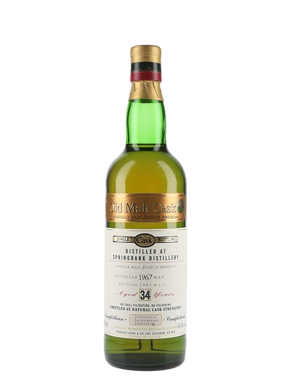 A bottle of Springbank 34 Year Old Single Malt Campbeltown Whisky, bottled for Douglas Laing's Old Malt Cask range. This was distilled in May 1967 and bottled at a natural cask strength of 43.4% ABV in May 2001.