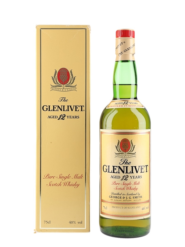 A bottle of Glenlivet 12 Year Old Pure Single Malt Scotch Whisky, distilled by George & J G Smith. We estimate this was bottled in the 1980s.