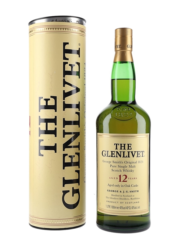 An old presentation litre bottle of The Glenlivet 12 Year Old Pure Single Malt Scotch Whisky.