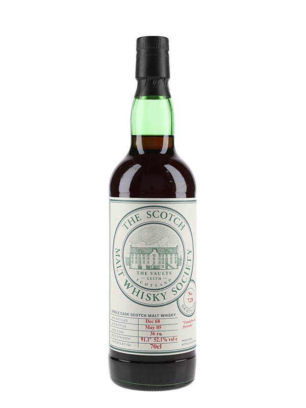 A bottle of Longmorn 36 Year Old Single Cask Single Malt Scotch Whisky from the Scotch Malt Whisky Society. This was distilled in December 1968 and bottled May 2005 at 52.1% ABV.
