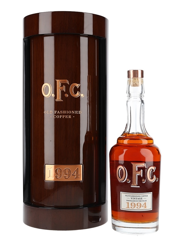 A bottle of Old Fashioned Copper Kentucky Straight Bourbon Whiskey, distilled in 1994 and matured for almost 30 years at what is now Buffalo Trace distillery. This bottling honours the OFC distillery and is presented in a hand-cut crystal bottle. The lacquered wooden case features copper detail and a revolving centre.