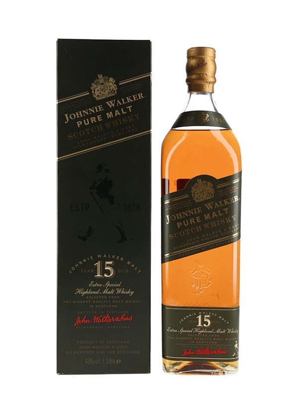 A litre bottle of Johnnie Walker 15 Year Old Pure Malt Scotch Whisky produced by John Walker & Sons and created from a selection of 15 mature Speyside and Island Malt Whiskies, including Talisker and Cragganmore. We estimate this was bottled in the 1990s.