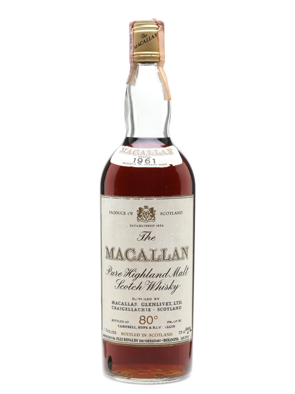 A bottle of The Macallan 1961, bottled by Campbell, Hope & King. This was bottled for the Italian market and imported by Rinaldi, we estimate in the 1970s.