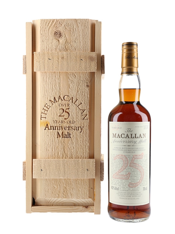 A bottle of The Macallan Single Highland Malt Scotch Whisky. This was matured in sherry casks for 25 years and bottled we estimate in the 2000s as part of the Anniversary Malt series.