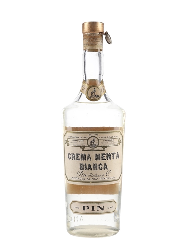 A bottle of Crema Menta Bianca From the pin Stefano distillery in Italy. We estimate this was bottled in the 1950s.